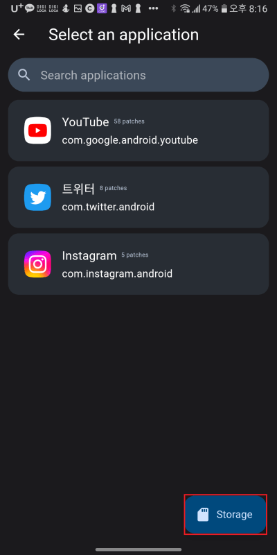 리밴스드 매니저를 실행 후 하단 중간의 Patcher을 눌러 줍니다. 그리고 Select an application을 누른 후 기존의 유튜브를 선택하는 것이 아닌 오른쪽 하단의 Storage를 눌러 줍니다. 그런 후 아까 다운로드한 유튜브 APK 파일을 선택해 줍니다.
